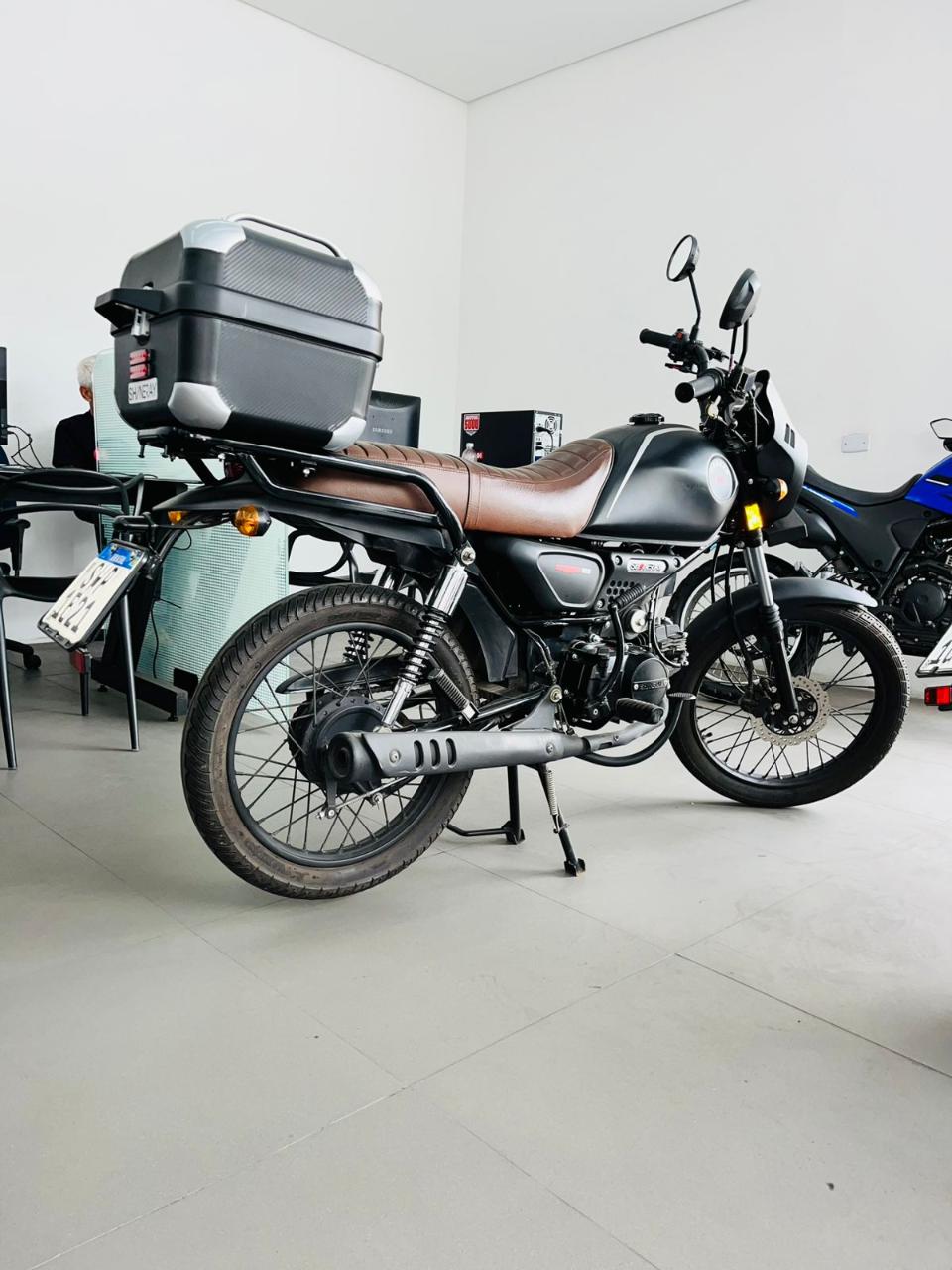 Suspensão dianteira: Garfo telescópico com curso maior, para melhor desempenho em terrenos irregulares.