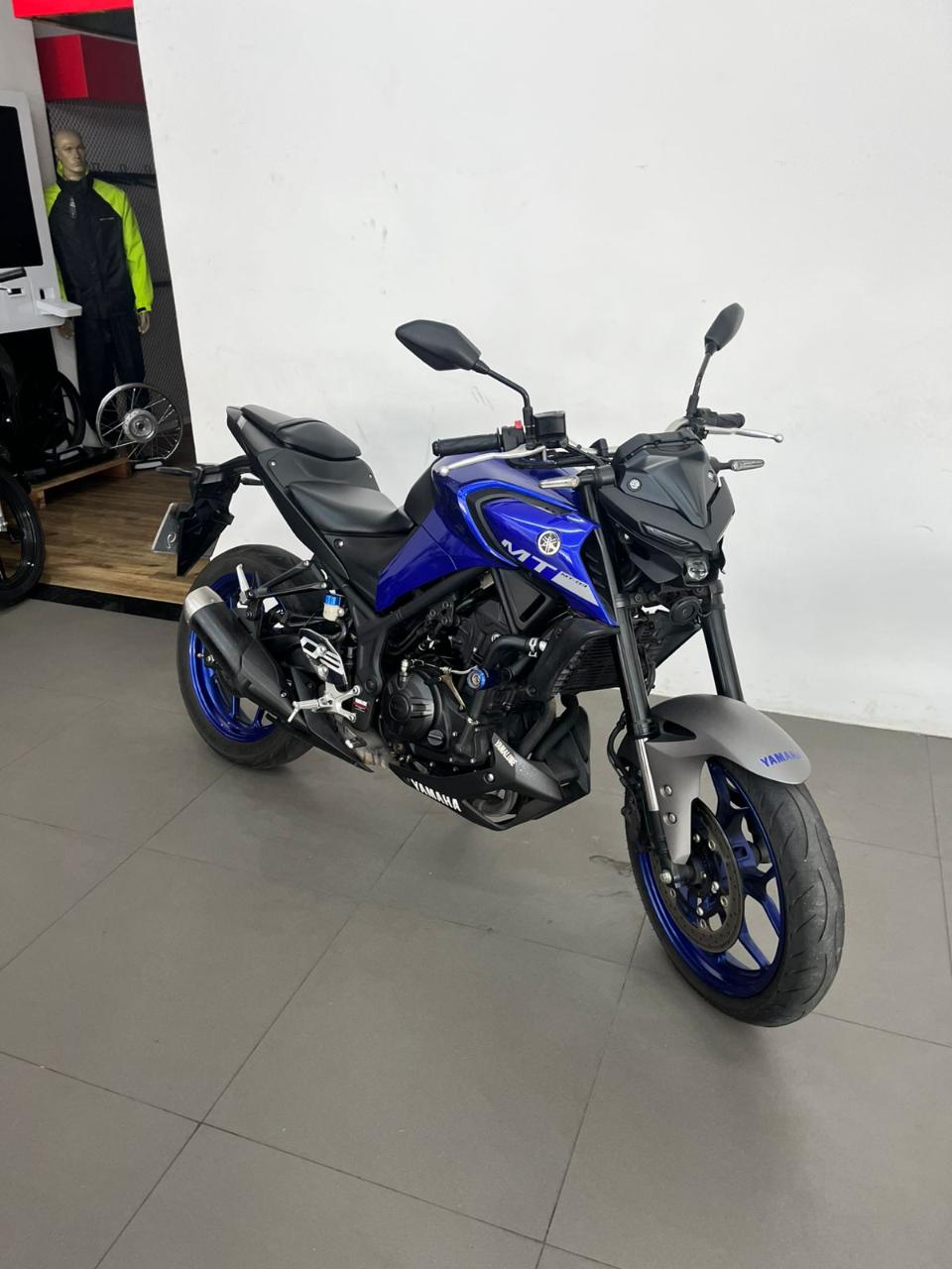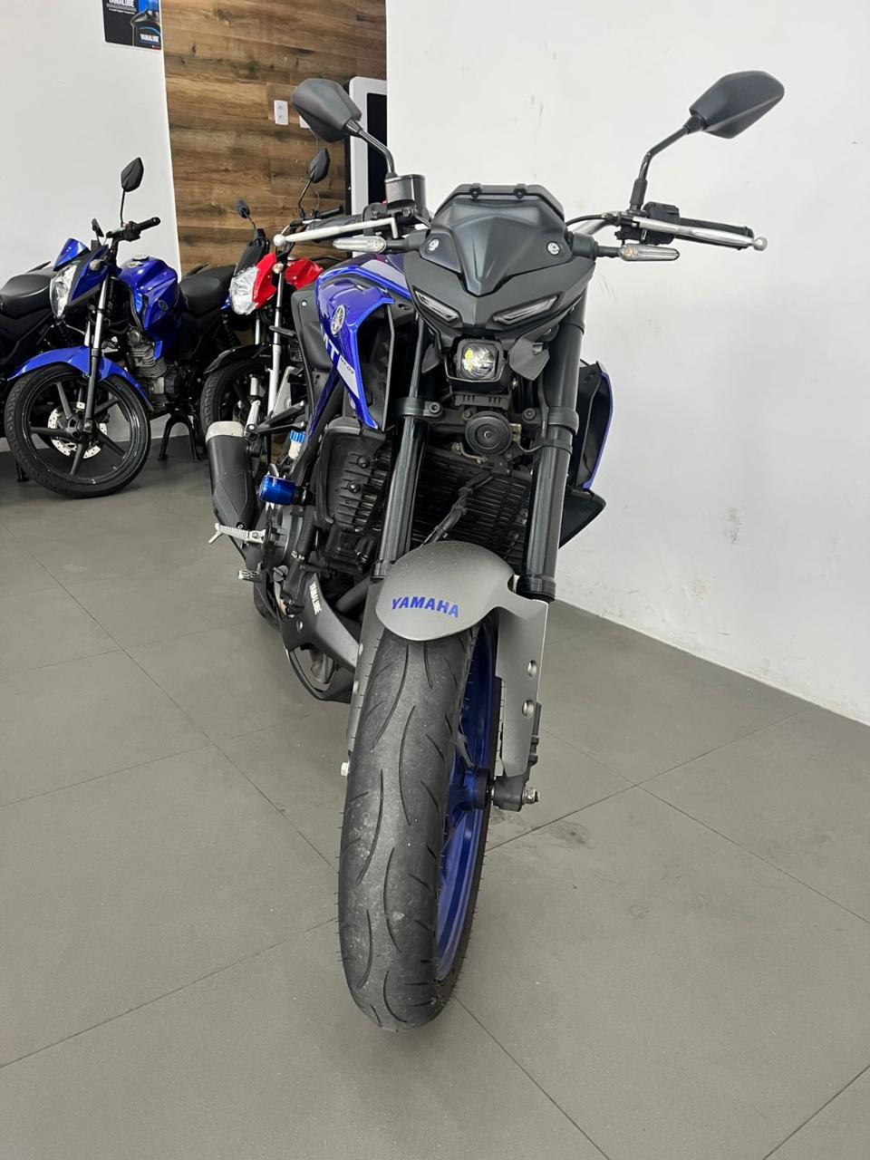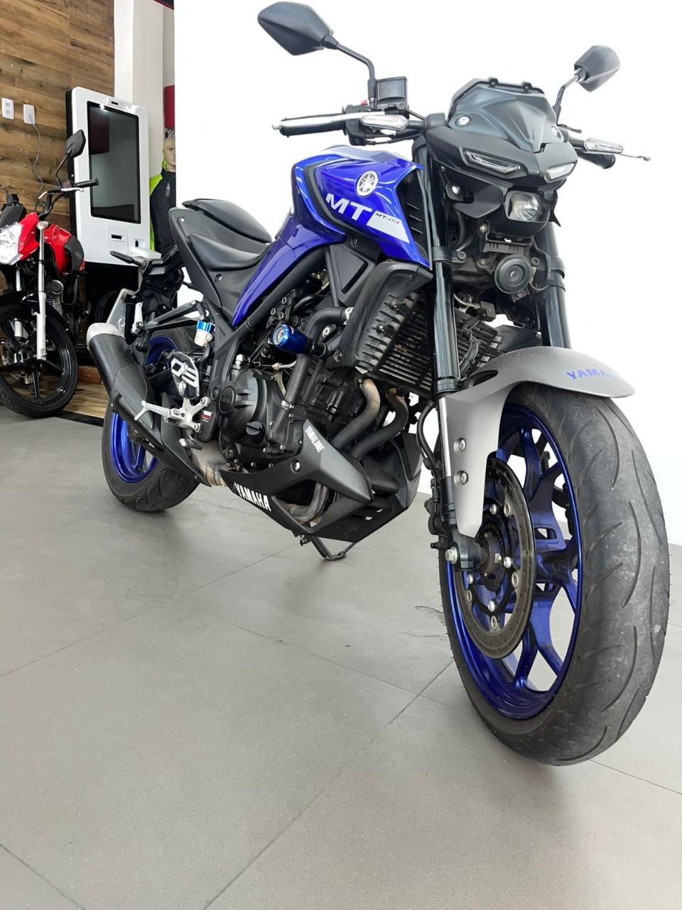 A ficha técnica da Yamaha MT-03 2022 inclui motor bicilíndrico de 321 cc, 41,3 cv de potência, 3,0 kgf.m de torque, câmbio de 6 velocidades e freios ABS nas duas rodas. Possui suspensão dianteira invertida, painel digital, farol em LED, iluminação DRL full LED e tanque de 14,2 litros.